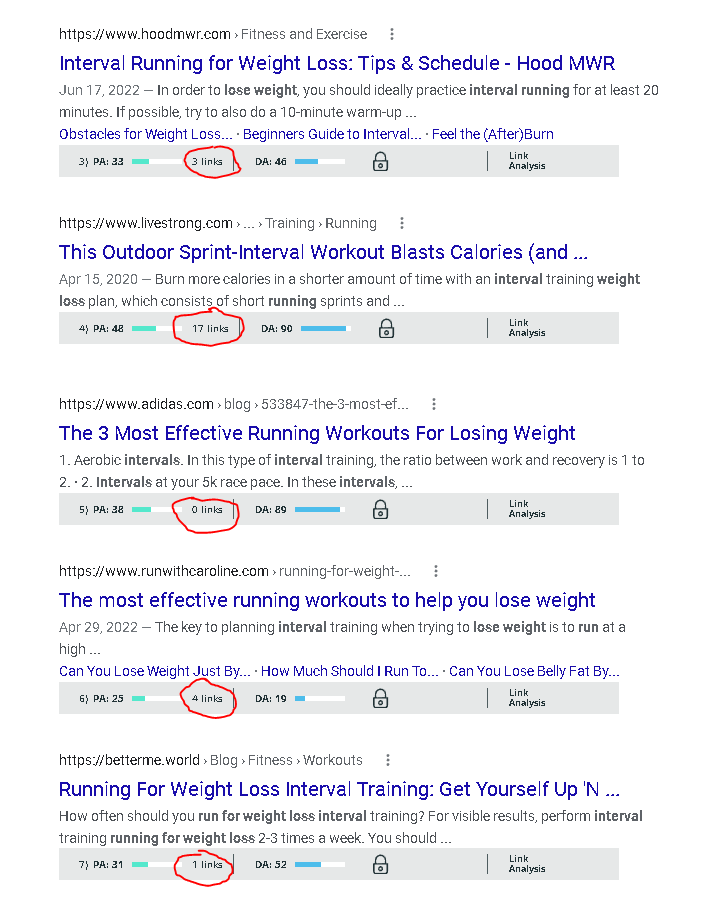 What you're looking for is circled in red. For a newer website, it will be very difficult to rank for a keyword that has websites with metrics like that already at the top (200+ backlinks on DA 61 & above). So, we want to find easier/long tail keywords.