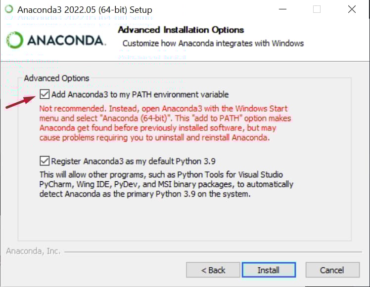 The download and installation should be straight forward, but there is an important step you have to do, and that is checking the box for adding Anaconda to your PATH environment variables.